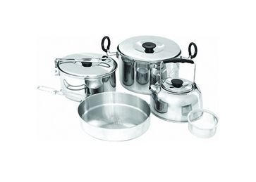 Материалы: нержавеющая сталь Размер: 210 х 210 х 140 мм Вес: 1310 г В комплекте: кастрюля с крышкой на 2,4 л; кастрюля с крышкой на 1,3 л; сковорода со складной ручкой; чайник, объемом 0,8 л. None Есть доставка.