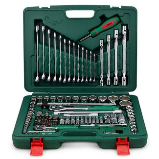 Описание Набор инструментов TK-124E включает в себя 124 предмета с посадочными квадратами ?" и ?". Все они изготовлены из высококачественной хромванадиевой стали — максимально прочного и долговечного материала.