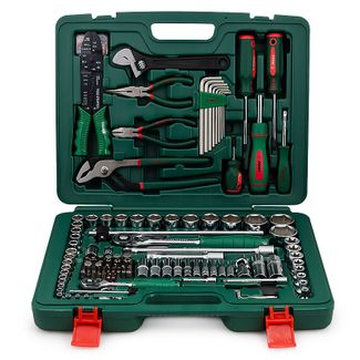 Назначение Набор инструментов TK-158E от HANS идеален для использования при проведении ремонта автомобиля. Он будет полезен при работе с крепежом различных размеров и рабочих профилей, так как в его комплектацию входит большое количество торцевых головок, а также при работе с электрикой благодаря наличию в нем различных шарнирно-губцевых инструментов. Описание Набор инструментов TK-158E включает в себя 158 предметов с посадочными квадратами ?" и ?". Они изготовлены из материала высшего качества — хромванадиевой стали, которая отличается прочностью, долговечностью и износостойкостью. Особенности Маслобензостойкие ручки трещоток, шарнирно-губцевых инструментов и отверток из набора инструментов TK-158E предотвращают их выскальзывание из рук, а также удобно лежат в ладони. Набор инструментов TK-158E поставляется в удобном пластиковом кейсе зеленого цвета с защелками. В нем каждый предмет находится в индивидуальной ячейке с фиксатором, что защищает Вас от утери инструментов, а также облегчает их поиск. None