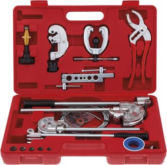 KA-6521 Набор предназначен для загибания и обрезки металлических труб. Набор для развальцовки и резки медных трубок ?: 6, 8, 10, 12, 14, 16 мм Инструмент для резки труб: 3-28 мм Набор для гибки труб: 4 размера Ключ переставной Инструмент для чистки труб гибкий Инструмент для работы с трубами Лента Набор уплотнительных колец None