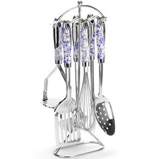 Кухонный набор 7 пр МВ (х20). Материал: нержавеющая сталь CrNi 18/10. Подставка: нержавеющая сталь. Ручки: пластик. Цвет: синий, белый. Рисунок: цветочный узор. Половник: 1 шт. Венчик: 1 шт. Шумовка: 1 шт. Лопатка с прорезями: 1 шт. Вилка: 1 шт. Пресс д/картофеля: 1 шт. Размер упаковки: 16,5 х 9,5 х 40,5 см. Упаковка: коробка. Вес: 1 кг. Страна производитель: Китай. Профессиональный кухонный набор MAYER& BOCH очень удобен в использовании, имеет стильную стальную подставку, которая прекрасно впишется в любой кухонный интерьер. Изделия снабжены удобными нескользящими пластиковыми ручками, декорированными нежным цветочным узором, которые защитят Ваши руки от ожогов. Высококачественная нержавеющая сталь CrNi 18/10, из которой выполнены рабочие поверхности, идеально подходит для приготовления пищи, предметы набора не окислятся со временем и не испортят вкус Ваших блюд. Кухонный набор придаст Вашей кухне элегантность, поднимет Ваше настроение и превратит приготовление еды в настоящее удовольствие! Подходит для мытья в посудомоечной машине. None