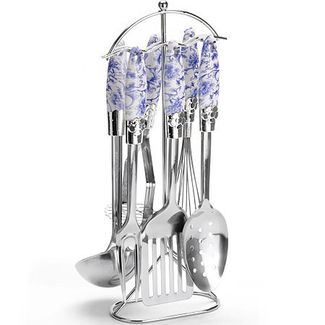 Кухонный набор 7 пр МВ (х20). Материал: нержавеющая сталь CrNi 18/10. Подставка: нержавеющая сталь. Ручки: пластик. Цвет: синий, белый. Рисунок: цветочный узор. Половник: 1 шт. Венчик: 1 шт. Шумовка: 1 шт. Лопатка с прорезями: 1 шт. Вилка: 1 шт. Пресс д/картофеля: 1 шт. Размер упаковки: 16,5 х 9,5 х 40,5 см. Упаковка: коробка. Вес: 1 кг. Страна производитель: Китай. Профессиональный кухонный набор MAYER& BOCH очень удобен в использовании, имеет стильную стальную подставку, которая прекрасно впишется в любой кухонный интерьер. Изделия снабжены удобными нескользящими пластиковыми ручками, декорированными нежным цветочным узором, которые защитят Ваши руки от ожогов. Высококачественная нержавеющая сталь CrNi 18/10, из которой выполнены рабочие поверхности, идеально подходит для приготовления пищи, предметы набора не окислятся со временем и не испортят вкус Ваших блюд. Кухонный набор придаст Вашей кухне элегантность, поднимет Ваше настроение и превратит приготовление еды в настоящее удовольствие! Подходит для мытья в посудомоечной машине. None