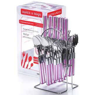 Столовый набор 25 пр MB (х12). Столовые ножи: 6 шт. Столовые вилки: 6 шт. Столовые ложки: 6 шт. Чайные ложки: 6 шт. Материал: нержавеющая сталь. Материал ручек: пластик. Материал подставки: сталь. Цвет: сиреневый, серебристый. Размер упаковки: 15,2 х 13,5 х 28 см. Упаковка: пластиковая коробка. Вес: 1,2 кг. Страна производитель: Китай. Набор столовых приборов MAYER& BOCH на 6 персон выполнен из прочной нержавеющей стали и цветного пластика. В набор входит 25 предметов: 6 столовых ножей, 6 столовых ложек, 6 столовых вилок и 6 чайных ложек и металлическая подставка. Приборы имеют удобные эргономичные пластиковые ручки. Прекрасное сочетание свежего дизайна и удобство использования предметов набора придется по душе каждому. Предметы набора расположены на подставке с секциями для каждого вида приборов. Набор столовых приборов подойдет для сервировки стола, как дома, так и на даче и всегда будет важной частью трапезы, а также станет замечательным подарком. Подходит для мытья в посудомоечной машине. None