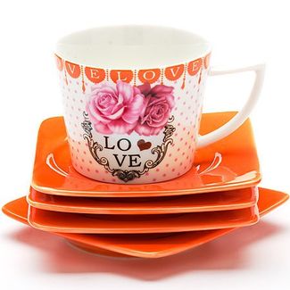 Кофейный набор 12 пр LR (х16). Чашка (6 шт)+блюдце (6 шт). Материал: керамика. Цвет блюдец: оранжевый. Рисунок на чашках: розы. Чашка: D 6,5 х 5 см/ 100 мл. Блюдце: D 10 см. Размер упаковки: 28,5 х 20,5 х 7 см. Упаковка: коробка. Вес: 1,39 кг. Страна производитель: Китай. Кофейный набор на 6 персон выполнен из высококачественной керамики. Оригинальный дизайн набора настроит на позитивный лад и подарит хорошее настроение с самого утра. На чашки нанесен рисунок в виде роз и надпись «LOVE», цветные блюдца квадратной формы. Набор упакован в стильную подарочную коробку. Внутренняя часть коробки задрапирована белой атласной тканью. Каждый предмет надежно зафиксирован внутри коробки благодаря специальным выемкам. Кофейный набор - идеальный и необходимый подарок для вашего дома и для ваших друзей в праздники, юбилеи и торжества! Он также станет отличным корпоративным подарком и украшением любой кухни. Подходит для мытья в посудомоечной машине. В наборе: 6 кофейных чашек, 6 блюдец. None