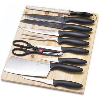 Замечательный набор ножей MAYER&BOCH выполнен из высококачественной нержавеющей стали и включает в себя: нож-топорик, поварской нож, разделочный нож, нож для хлеба, универсальный нож, нож для чистки, кухонные ножницы, точилку для ножей и деревянную разделочную доску. Специальный дизайн ручек из пластика обеспечит безопасную работу и комфортное положение в руке. Большая деревянная разделочная доска, которая входит в набор, позволит легко выполнить даже самую трудоемкую работу (например, очистить рыбу от костей или сделать отбивную) и при этом не испачкать и не повредить поверхность стола. Также, этот набор может стать отличным подарком для начинающей хозяйки, потому что он включает в себя все необходимые ножи для приготовления пищи. Набор MAYER&BOCH станет для Вас отличным помощником на кухне. Подходит для мытья в посудомоечной машине. None