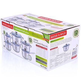 Набор посуды 12пр МВ (х2). Материал: нержавеющая сталь. Крышки: стекло, сталь. Ручки: сталь. Кастрюля: 2,1 л /D16 х 10,5 см. Кастрюля: 2,9 л /D18 х 11,5 см. Кастрюля: 2,9 л /D18 х 11,5 см. Кастрюля: 3,9 л /D20 х 12,5 см. Кастрюля: 6,6 л /D24х 14,5 см. Ковш: 2,1 л / D16 х 10,5 см. Дно: индукционное. Толщина стенок 0,5 мм. Размер упаковки: 49 х 27,5 х 22,5 см. Вес: 7,2 кг. Страна производитель: Китай.Набор посуды MAYER& BOCH изготовлен из высококачественной нержавеющей стали c толщиной стенок 5 мм и усиленным индукционным дном. Этот набор кастрюль предназначен для здорового и экологичного приготовления пищи, многослойная сталь обеспечит быстрый нагрев продуктов и надолго сохранит тепло. Изделия снабжены крышками из термостойкого стекла с паровыпуском и металлическим ободом, а также удобными не нагревающимися стальными ручками. Внешняя поверхность кастрюль гладкая с зеркальной полировкой, имеет гравировку в форме колец. В комплекте 12 предметов: 5 кастрюль с крышками, 1 ковш с крышкой. Подходит для использования на всех типах плит, включая индукционные. Подходит для мытья в посудомоечной машине. None