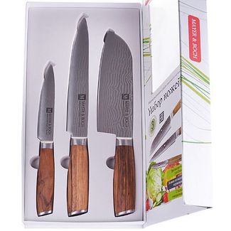 Набор ножей 3 пр МВ (х12). Материал лезвий: нержавеющая сталь. Материал ручек: дерево. Цвет: коричневый. Нож восточный: лезвие 18 см. Нож разделочный: лезвие 21 см. Нож универсальный: лезвие 13 см. Размер упаковки: 37 х 16 х 3,5 см. Упаковка: коробка. Вес: 741 г. Страна производитель: Китай.Набор ножей MAYER& BOCH состоит из 3-х универсальных ножей разного размера. Лезвия выполнены из высококачественной нержавеющей стали, имеют износостойкую режущую кромку, благодаря чему ножи дольше остаются острыми, а текстурные эргономичные рукоятки ножей, выполненные из черного каучука, обеспечивают безопасную работу и комфортное положение в руке. Это прекрасные ножи для ежедневной резки фруктов, овощей и мяса. Изделия имеют гладкую, легко очищаемую поверхность. Оригинальный дизайн набора и качество исполнения не оставят Вас равнодушными. Набор MAYER& BOCH станет великолепным подарком и отлично украсит интерьер Вашей кухни. Готовьте с удовольствием! None