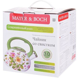 Чайник эмалированный МВ (х12). Материал: углеродистая сталь. Внешнее/внутреннее покрытие: эмаль. Дно: индукционное. Ручка: бакелит. Крышка: сталь, бакелит. Объем: 3000 мл. Вес: 1 кг. Размер упаковки: 21 х 21 х 21,5 см. Страна производитель: Китай.Чайник MAYER& BOCH выполнен из высококачественной углеродистой стали. Углеродистая сталь устойчива к высоким температурам и не теряет своих свойств даже при очень сильном нагреве. Углеродистая сталь быстро и равномерно нагревается и хорошо сохраняет тепло, легкая, прочная и долговечная. Капсулированное дно с прослойкой из алюминия обеспечивает наилучшее распределение тепла. Внешняя и внутренняя поверхности чайника покрыты эмалью. Эргономичная ручка выполнена из бакелита. Носик чайника оснащен насадкой-свистком, который позволяет контролировать процесс кипячения или подогрева воды. Поверхность изделия гладкая, что облегчает уход за ним. Большой объем чайника, позволит приготовить напиток для большой семьи или компании. Эстетичный и функциональный, с эксклюзивным дизайном, чайник будет оригинально смотреться на любой кухне. Подходит для использования на всех типах плит, включая индукционные. Подходит для мытья в посудомоечной машине. None