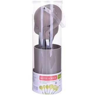 Кухонный набор 7 пр МВ (х6). Материал: нейлон, нержавеющая сталь. Подставка: полипропилен. Половник: 1 шт. Ложка гарнирная: 1 шт. Ложка для помешивания: 1 шт. Лопатка с прорезями: 1 шт. Шумовка: 1 шт. Ложка для спагетти: 1 шт. Прозрачная упаковка: 12 х 12 х 35,5 см. Вес: 650 г. Страна производитель: Китай.Набор кухонных принадлежностей MAYER& BOCH включает в себя половник, гарнирную ложку, ложку для помешивания, лопатку с прорезями, шумовку, ложку для спагетти и подставку. Приборы изготовлены из нейлона, нержавеющей стали и цветного полипропилена, отличаются высокой износоустойчивостью и надежностью, не окисляются со временем и не портят вкус продуктов, кроме того, они абсолютно безопасны для любых антипригарных покрытий. Входящая в набор удобная высокая подставка для хранения предметов набора поможет сэкономить место на рабочем столе. Набор упакован в красивую прозрачную упаковку с ручкой. None