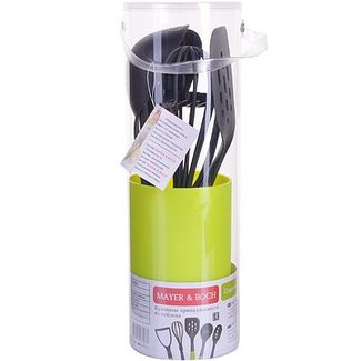 Кухонный набор 6 пр МВ (х6). Материал: нейлон, термопластик. Подставка: полипропилен. Половник: 1 шт. Ложка гарнирная: 1 шт. Толкушка для картофеля: 1 шт. Лопатка с прорезями: 1 шт. Венчик: 1 шт. Прозрачная упаковка: 12 х 12 х 35,5 см. Вес: 660 г. Страна производитель: Китай.Набор кухонных принадлежностей MAYER& BOCH включает в себя половник, гарнирную ложку, толкушку для картофеля, лопатку с прорезями, венчик и подставку. Приборы изготовлены из нейлона, нержавеющей стали, дерева и цветного полипропилена, отличаются высокой износоустойчивостью и надежностью, не окисляются со временем и не портят вкус продуктов, кроме того, они абсолютно безопасны для любых антипригарных покрытий. Входящая в набор удобная высокая подставка для хранения предметов набора поможет сэкономить место на рабочем столе. Набор упакован в красивую прозрачную упаковку с ручкой. None