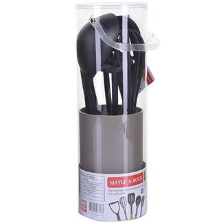 Кухонный набор 6 пр МВ (х6). Материал: нейлон, термопластик. Подставка: полипропилен. Половник: 1 шт. Ложка гарнирная: 1 шт. Толкушка для картофеля: 1 шт. Лопатка с прорезями: 1 шт. Венчик: 1 шт. Прозрачная упаковка: 12 х 12 х 35,5 см. Вес: 660 г. Страна производитель: Китай.Набор кухонных принадлежностей MAYER& BOCH включает в себя половник, гарнирную ложку, толкушку для картофеля, лопатку с прорезями, венчик и подставку. Приборы изготовлены из нейлона, нержавеющей стали, дерева и цветного полипропилена, отличаются высокой износоустойчивостью и надежностью, не окисляются со временем и не портят вкус продуктов, кроме того, они абсолютно безопасны для любых антипригарных покрытий. Входящая в набор удобная высокая подставка для хранения предметов набора поможет сэкономить место на рабочем столе. Набор упакован в красивую прозрачную упаковку с ручкой. None