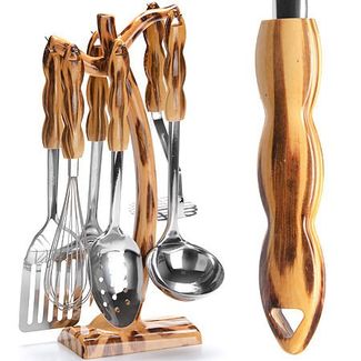 Кухонный набор 7 пр SK (х20). Материал: нержавеющая сталь CrNi 18/10. Ручки, подставка: пластик. Цвет: коричневый, под дерево. Половник: 1 шт. Венчик: 1 шт. Шумовка: 1 шт. Лопатка с прорезями: 1 шт. Вилка: 1 шт. Пресс д/картофеля: 1 шт. Размер упаковки: 10 x 16 x 38 см. Упаковка: коробка. Вес: 1,0 кг. Страна производитель: Китай. Этот профессиональный кухонный набор очень удобен в использовании, имеет стильную подставку из пластика, стилизованного под дерево, которая прекрасно впишется в любой кухонный интерьер. Изделия снабжены удобными нескользящими ручками из термопластика, защищающими Ваши руки от ожогов. Высококачественная нержавеющая сталь CrNi 18/10, из которой выполнены рабочие поверхности, идеально подходит для приготовления пищи, предметы набора не окислятся со временем и не испортят вкус Ваших блюд. Кухонный набор придаст Вашей кухне элегантность, поднимет Ваше настроение и превратит приготовление еды в настоящее удовольствие! None