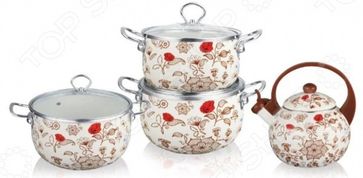 Набор посуды Kelli KL-4458 Розы обязательно пригодится на любой кухне. Выбрав одну из 3 кастрюль нужного объема, вы сможете сварить суп или рагу, бульон, макароны, приготовить компот или кисель. Также в набор входит эмалированный чайник объемом 2,5 литра. Насадка-свисток с защитным кольцом позволяет контролировать процесс нагрева и кипячения воды. Эмалевое покрытие внутри и снаружи защищает продукты от контакта с металлом, не влияет на вкусовые качества пищи. Облегчает чистку кастрюль после готовки. Крышки изготовлены из жаропрочного стекла. Они плотно прилегают к стенкам посуды, поддерживают температуру и сохраняют аромат блюда. Через прозрачный материал удобно наблюдать за процессом готовки. Через отверстия в крышках удаляется избыточный пар. Металлическая кайма защищает края крышки от появления трещин и сколов. Клепаные ручки не нагреваются. Позволяют удобно ухватить кастрюли для помешивания блюда, переноски кастрюли с плиты или установки на нее, мытья. None Возможен самовывоз. Есть доставка.