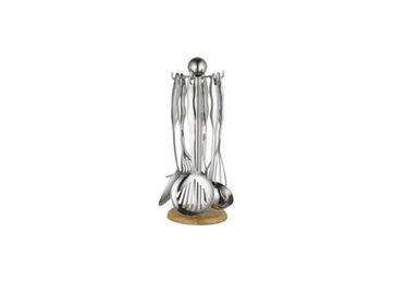 Набор кухонных принадлежностей из 7 предметовcостав: нержавеющая сталь улучшенного качествакартофелемялкаложкаполовниквилка для мясашумовкавенчик полностью металлическийметаллическая подставка с с круглым деревянным основанием и шариком None