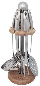 половник ложка поварская шумовка вилка поварская картофелемялка лопатка перфорированная подставка Количество предметов, шт. – 7 Материал – нержавеющая сталь 18/10 Материал подставки – нержавеющая сталь 18/10 и дерево Полировка – зеркальная Пригодна для мытья в посудомоечной машине. None
