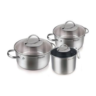 Набор 6пр. Rondell Symphonia 382RDSХАРАКТЕРИСТИКИ Аксессуары : Стильные из нержавеющей стали Внешнее покрытие и отделка : Сатинированная полировка с декоративными лазерными насечками Материал : Высококачественная нержавеющая сталь 18/10 Материал крышки : Термостойкое стекло Основной цвет : Стальной Подарок : Буклет с рецептами от шеф-повара Тип крепления аксессуаров : Клепочное Толщина дна : 5,0 мм Толщина стенок : 0,7 мм Упаковка : Подарочная упаковка с ручкойОПИСАНИЕ Любая хозяйка заслуживает того, чтобы на ее кухне появились качественные принадлежности для быстрого приготовления вкусных и полезных блюд. Rondell по привлекательным ценам предлагает ознакомиться с комплектацией наборов посуды, обладающей уникальными эксплуатационными характеристиками. None