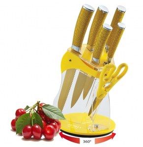 Набор ножей, 7 предметов с антибактериальным покрытием*. Лезвие из нержавеющей стали с цветным покрытием золотистого цвета, ручки декорированные под кожу в цвет лезвия. 8”/1,8 мм - нож поварской 8”/1,8 мм - нож разделочный 8”/1,8 мм - нож для хлеба 5”/1,2 мм - нож универсальный 3,5”/1,2 мм - нож для овощей Ножницы. Прозрачная подставка из акрила с возможностью вращения на 360 0С. Анатомическая форма ручек комфортно лежит в руке и обеспечивает удобство и безопасность работы. Подарочная упаковка с пластиковой ручкой. None