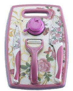 Набор ножей, 5 предметов с антибактериальным покрытием*. Лезвие из нержавеющей стали с цветным покрытием и двусторонним декором, ручки прорезиненные. 4,5”/1,8 мм - нож поварской «сантоку» 3,5”/1,2 мм - нож для овощей Овощечистка Точилка для ножей Доска разделочная. Анатомическая форма ручек комфортно лежит в руке и обеспечивает удобство и безопасность работы. Упаковка - блистер. None