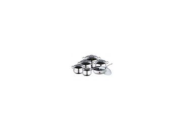 12 предметов: нержавеющая сталь , кастрюля-3,9л.(20x12,5cм) кастрюля-5,1л.(22х13,5см) кастрюля- 6,5л.(24х14,5см) кастрюля- 9,5л.(26х18см), сковорода- 4,5л.(26х8,5см) с "мраморным" антипригарным покрытием, ковш-2,9л (18*11,5см) с утолщенными стенками, стеклянные крышки None