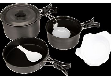Набор рассчитан на 2-3 человек. Комплектация: большой котелок, маленький котелок, сковородка, суповая ложка, складной половник и три пластмассовые миски. Все котелки изготовлены из анодированного алюминия с трехслойным жаро- и износостойким антипригарным ... None