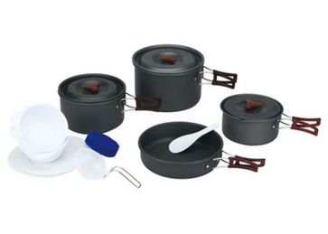 Набор посуды с многослойной антипригарной внутренней поверхностью. В составе три кастрюли, крышка/сковородка со складными ручками, половник, лопатка, 5 пластиковых чашек, 2 пластиковые тарелки, губка для мытья посуды и сетчатый мешочек для переноски. Утол... None