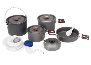 Описание Набор посуды с многослойной антипригарной внутренней поверхностью. В составе две кастрюли, котелок, чайник, крышка/сковородка со складными ручками, половник, лопатка, 6 пластиковых чашек, 3 пластиковые тарелки, губка для мытья посуды и сетчатый м... None