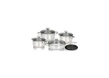 Набор посуды из 9 предметов20см Кастрюля с крышкой (3,1л) 18см Кастрюля с крышкой (2,3л) 16см Кастрюля с крышкой (1,6л) 24см Сковородка с крышкой (2,9л) Черная бакелитовая подставка Многослойное термоаккумулирующее дно Крышки из термостойкого стекла Ручки из нержавеющей стали 18/10 None