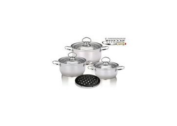 24см Кастрюля с крышкой (5,2л) 18см Кастрюля с крышкой (2,3л) 16см Кастрюля с крышкой (1,6л) Черная бакелитовая подставка Многослойное термоаккумулирующее дно Крышки из нержавеющей стали Ручки из нержавеющей стали 18/10 None