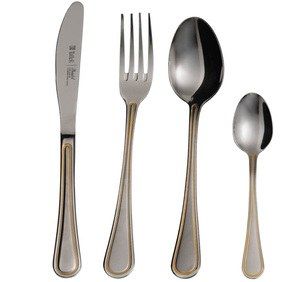 Ложка столовая - 6 Ложка чайная - 6 Вилка - 6 Нож - 6 Количество предметов, шт. – 24 Материал – нержавеющая сталь 18/10 с покрытием из золота 18 карат (750 проба) Материал лезвия ножей – легированная сталь 420S37 Полировка – комбинированная Пригодна для мытья в посудомоечной машине. None