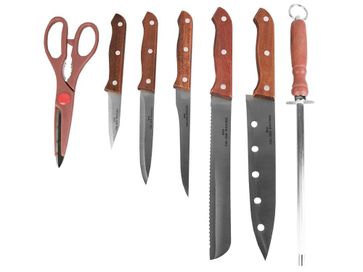 В комплект входят: <br> Поварской нож.<br> Хлебный нож.<br> Обвалочный нож.<br> Универсальный нож.<br> Нож для чистки овощей.<br> Кухонные ножницы.<br> Мусат.<br> Подставка для ножей.<br>