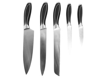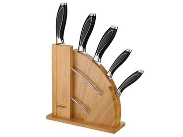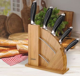 В комплект входят: <br> Нож шеф-повара.<br> Хлебный нож.<br> Универсальный нож.<br> Нож для чистки овощей.<br> Нож общего назначения.<br> Подставка для ножей.<br>