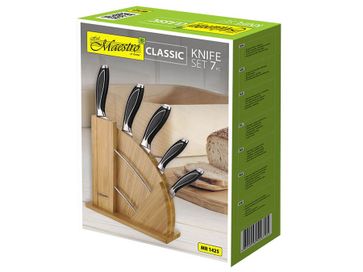 Характеристики: <br> Материал лезвий: нержавеющая сталь.<br> Материал ручек: пластик.<br> Материал подставки: дерево.<br> Габариты подставки (ВхШхГ): 245 х 240 х 80 мм.<br> None Страна производства: Китай