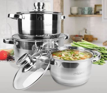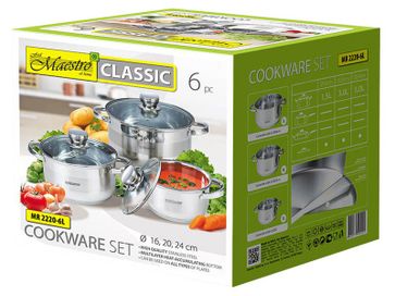 Набор кастрюль MR-2220-6L отлично подходит для повседневного приготовления супов, гарниров и других блюд. Посуда выполнена из нержавеющей стали, поэтому не выделяет вредные вещества, легко моется и долгое время сохраняет безупречный вид. Разные по объему кастрюли дополнены мерными шкалами и крышками из жаропрочного стекла.<br>