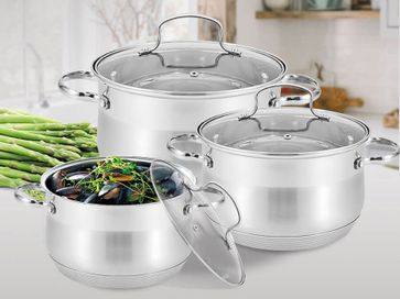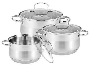 В комплект входят: <br> Кастрюля с крышкой 18 х 11,5 см, 2,9 л.<br> Кастрюля с крышкой 22 х 13,5 см, 5,1 л.<br> Кастрюля с крышкой 24 х 14,5 см, 6,5 л.<br>