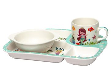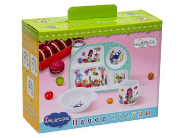 Состав набора: <br> Блюдо 4 секции.<br> Салатник 110 мм.<br> Кружка 200 мл.<br>