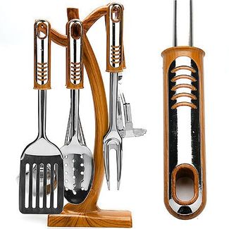 Кухонный набор 7 пр SK (х20). Материал: нержавеющая сталь CrNi 18/10. Ручки, подставка: пластик. Цвет: коричневый, под дерево. Половник: 1 шт. Венчик: 1 шт. Шумовка: 1 шт. Лопатка с прорезями: 1 шт. Вилка: 1 шт. Пресс д/картофеля: 1 шт. Размер упаковки: 10,7 x 15,8 x 38,2 см. Вес: 1 кг. Страна производитель: Китай. Этот профессиональный кухонный набор очень удобен в использовании, имеет стильную подставку из пластика, стилизованного под дерево, которая прекрасно впишется в любой кухонный интерьер. Изделия снабжены удобными нескользящими ручками из термопластика, защищающими Ваши руки от ожогов. Высококачественная нержавеющая сталь CrNi 18/10, из которой выполнены рабочие поверхности, идеально подходит для приготовления пищи, предметы набора не окислятся со временем и не испортят вкус Ваших блюд. Кухонный набор придаст Вашей кухне элегантность, поднимет Ваше настроение и превратит приготовление еды в настоящее удовольствие! None