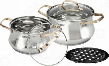 Кухня это место, где всегда приятно провести время, насладившись едой, приготовленной собственными руками. Для того, чтобы сделать пребывание на ней максимально комфортным, нужно предусмотреть все мелочи и заранее купить набор кастрюль. Набор кастрюль Vitesse VS-2082 будет отличным дополнением к комплекту вашей кухонной утвари. Приготовление любимых блюд с его приобретением перейдет на качественно новый уровень и вы сможете воплотить в жизнь любые кулинарные идеи. В комплект входят две кастрюли с крышками и круглая подставка под горячее. Набор многофункционален и удобен в использовании, подойдет для варки супов, приготовления блюд из мяса и рыбы, гарниров, соусов т.д. Особенности и преимущества Стильные золотистые ручки из гальванизированной стали. Крышки из термостойкого стекла с паровыпуском и металлическими ободками для защиты от сколов и трещин. Капсулированное дно имеет прослойку из алюминия и обеспечивает равномерное распределение тепла. Шкала литража нанесена на внутреннюю стенку кастрюль, позволяет точно отмерить объем набранной жидкости. Многофункциональность посуда совместима с газовыми, электрическими, стеклокерамическими, чугунными, галогеновыми и индукционными конфорками. В качестве материала изготовления используется высококачественная нержавеющая сталь. Этот металл повсеместно применяется в производстве кухонной посуды, благодаря долговечности и устойчивости к образованию царапин и трещин. Сталь, даже под воздействием высоких температур, не вступает в реакции с, содержащимися в продуктах, кислотами и щелочами, что способствует максимальному сохранению полезных веществ и микроэлементов. Рекомендации по уходу Чтобы продлить эксплуатационный срок посуды из нержавеющей стали, необходимо придерживаться рекомендациям по уходу. Мойте посуду мягкими губками и жидкими моющими средствами. Не пользуйтесь сухими абразивными средствами, чтобы не поцарапать поверхность. После мытья рекомендовано вытереть насухо салфеткой или полотенцем. None Возможен само