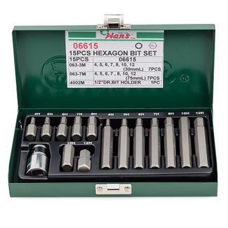 06615 комплект шестигр. бит в кейсе 15 предметов Биты шестигранные: 4,5,6,7,8,10,12 мм (L=30мм) Биты шестигранные: 4,5,6,7,8,10,12 мм (L=75мм) Битодержатель 1/2” None Страна производства: Тайвань