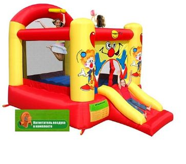 Прочность батута на растяжение - до 136 кг, прочность на разрыв - до 14 кг, прочность на соединение - до 27 кг. Изделие выдерживает широкий диапазон температур: от – 10 до + 40 °C. Насос батута высокого качества, высокоэффективен, безопасен при использовании и безвреден для окружающей среды. Насос можно использовать при температуре от -15 до + 40 °C. Помимо этого, он оснащен устройством защиты. При возникновении в насосе короткого замыкания или при прочих возникших проблемах при его эксплуатации, он немедленно выключается, тем самым обеспечивает безопасность пользователю надувного батута. Насос отвечает экологическим стандартам ЕС, а также имеет сертификат безопасности GS. ТЕХНИЧЕСКИЕ ХАРАКТЕРИСТИКИ: Название артикула: Надувной батут "Забавный клоун"Размеры изделия: 330 см x 230 см x 230 смВысота основания батута: 40 смРазмеры батута: 240 см x 210 смРазмеры прыжковой поверхности: 190 см x 165 смВысота защитной сетки-ограждения: 120 смРазмеры горки: 92 см x 85 смВысота площадки горки: 40 смШирина скользящей поверхности: 55 смДопустимая нагрузка: 113 кгДопустимое количество детей на батут - 3 ребенка (вес каждого ребенка не должен превышать 38 кг или 2 ребенка по 45 кг)Прыжковая поверхность?ПВХ ламинированный?laminated PVC?.Подъем: ПВХ ламинированный ?laminated PVC?.Горка: скользящая поверхность: ПВХ ламинированный, ламинированная ткань Оксфорд.Прочее: ламинированная ткань Оксфорд.Застежки: лавсан. Крепеж к земле: пластмасса. None Можно купить без предварительного заказа. Возможен самовывоз. Есть доставка.