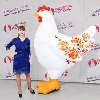 Костюм Курочки Рябы Наконец-то у Петушка появилась подруга – белая и нарядная Курочка Ряба. В росписях костюм используют, как декорация на Масленицу, а ещё это отличный рекламный инструмент для промоутера, если необходимо раскрутить магазин или товар. Ведь надувной костюм обладает великолепным внешним видом и повадками. Современный костюм курицы Надувной костюм Курица 2,5 метра в высоту – и на празднике, и в рекламе её будет видно хорошо, и она точно не затеряется в толпе. Легкая в использовании и переноске, компактная, когда упакована. Работает автономно от аккумуляторов и внутри совсем не жарко, ведь воздуха завались. Гарантия 1 год. Доставка транспортными компаниями. None Возможен самовывоз. Есть доставка.