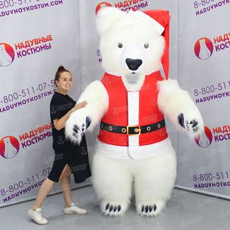 Поздравление на Новый Год белым медведем Такого мир ещё не видел – надувной белый медведь примерил на себя одежду Деда Мороза и теперь готовится к Новому Году. Красивый костюм может изменить внешний вид не только человека, но и медведя, убедитесь в этом сами. Для Умки мы отшили новую одежду, и она ему в самую пору. Белый полярный медведь круглый год носится по городу. Раньше Умка поздравлял именинников на днях рождениях, выпускников из колледжей, матерей с новорожденными из роддома, а теперь не обязательно звать даже Дедушку Мороза, Умка сделает работу за него – выслушает о содеянном за год, послушает стишок, станцует и вручит подарок. Надувной костюм медведь в полной комплектации Аксессуары к надувным костюмам опциональны, могут покупаться отдельно и докупаться уже после приобретения костюма. Они изменяют внешний вид, делают гардероб и возможности аниматора разнообразнее. И теперь новогодний мишка продаётся сразу в костюме, уже ничего докупать не нужно. Выгода состоит в том, что при полном комплекте стоимость ниже, чем приобретать всё по отдельности. Только представьте какой фурор вызовет такой косолапый Дед Мороз под Новый Год. Косолапый Дед Мороз Надувной меховой костюм медведь Умка одетый в одежду, куртку и колпак. Костюм изготовлен из плотной синтетической ткани, не пропускающей воздух. Сверху второй слой – искусственный белоснежный мех. Одежда отшита из такой же ткани, имеет красивую сублимационную полноцветную печать. Колпак закрепляется при помощи пуговиц, куртка одевается обычным способом. Костюм управляется аниматором изнутри. Работа осуществляется от нагнетателя и перезаряжаемых батарей, работающих до 2 часов. Стопы съемные – удобно чистить, менять на ботинки и заменять при сильном износе на новые. Производственная компания “Надувные Костюмы ком” – магазин аниматора и сервис. Доставка осуществляется транспортными компаниями в любой город России и зарубежья. Гарантия на изделия 1 год. Всегда в наличии запасные части, комплектующие и надувные костюмы. Беспл