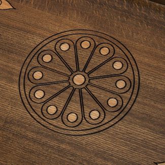 На лицевой поверхности аккуратно вырезан герб Армении, причем нас детализировано, что современное лазерное оборудование не идет в сравнение. Вторая створка, с обратной стороны, представляет собой поле для игры в шашки, размером 8х8 клеток. Изнутри оформление более «спокойное» - круглый узор в центре и треугольники около каждой ячейки.