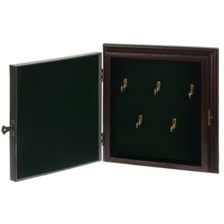 Ключница в прихожую оборудована 5 крючками для ключей и петлями для настенного размещения, внутри обита тёмно-зелёным бархатистым материалом, оснащена замочком, фиксирующим дверцу, обшита кожзамом и украшена объёмным декором с надписью "Ключи от счастья".