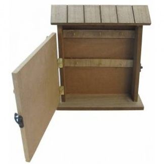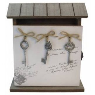Ключница размером 24*22*6 см выполнена из дерева и оборудована петлями для настенного размещения, но также может использоваться и без крепления к стене. Ключница оснащена 6 крючками для ключей внутри отсека 20*17*4 см, расположенного за открывающейся дверцей, украшенной символичными декоративными ключиками и фиксирующейся в закрытом положении удобным металлическим замочком.