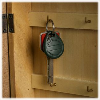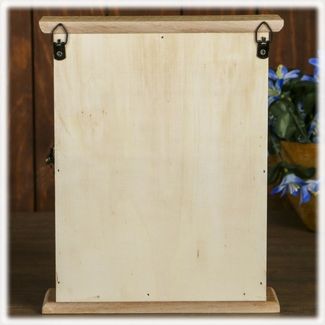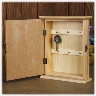 Ключница в прихожую размером 26*21*7 см изготовлена из дерева, оборудована 6 крючками для ключей и петлями для настенного размещения, оснащена крючком, фиксирующим дверцу. Размеры внутреннего отсека 22*17*4 см подойдут для удобного расположения шести связок ключей.