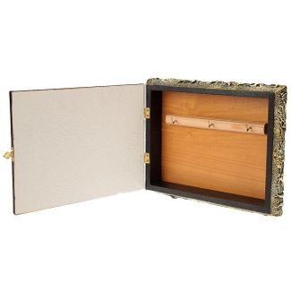 Размер ключницы 27*22*6 см. Она оснащена 3 удобными крючками для ключей, оборудована петлями для настенного размещения и элегантным замочком, фиксирующим дверцу. Внутренняя часть ключницы - 23*18*4 см.
