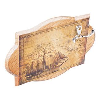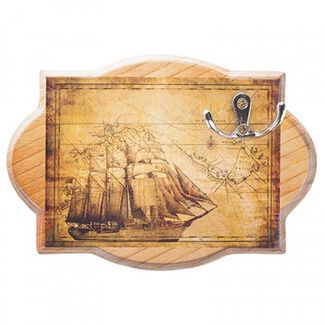 Открытая настенная ключница "Мореход" представляет собой деревянное панно оригинальной формы с нанесённым рисунком в виде парусника на фоне фрагмента карты и покрытое лаком, на котором закреплён двойной металлический крючок для ключей. Для настенного размещения с обратной стороны ключницы "Мореход" предусмотрены петли, с помощью которых ключницу можно повесить в прихожей.