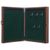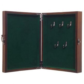 Ключница в прихожую размером 25*20*5 см изготовлена из дерева, оборудована 5 крючками для ключей и петлями для настенного размещения, внутри обита тёмно-зелёным бархатистым материалом, оснащена замочком, фиксирующим дверцу. Размеры внутреннего отсека (22.5*17.5*4 см) подойдут для удобного расположения пяти связок ключей.