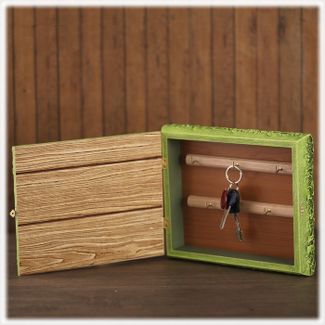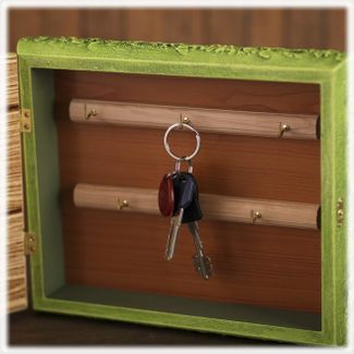 Размер ключницы 27*22*6 см. Она оснащена 5 удобными крючками для ключей, оборудована петлями для настенного размещения и элегантным замочком, фиксирующим дверцу. Внутренняя часть ключницы - 23*18*4 см.