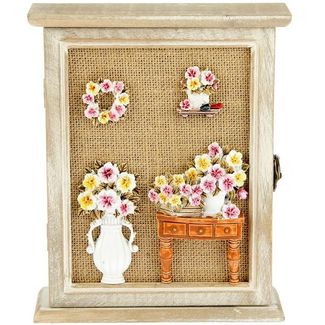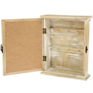 Ключница в прихожую размером 26*21*7 см изготовлена из дерева, оборудована 6 крючками для ключей и петлями для настенного размещения, оснащена крючком, фиксирующим дверцу. Размеры внутреннего отсека 22*17*4 см подойдут для удобного расположения шести связок ключей.